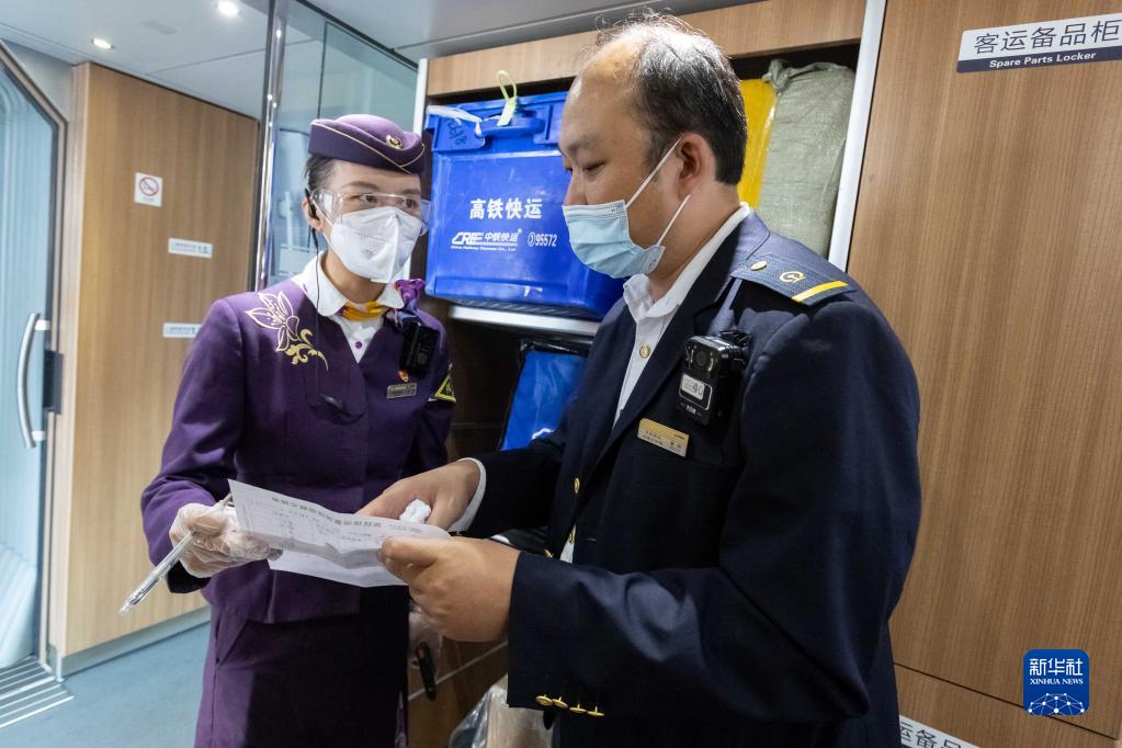 11月1日,在G1373次列車上,鐵路站車工作人員交接貨物清單。