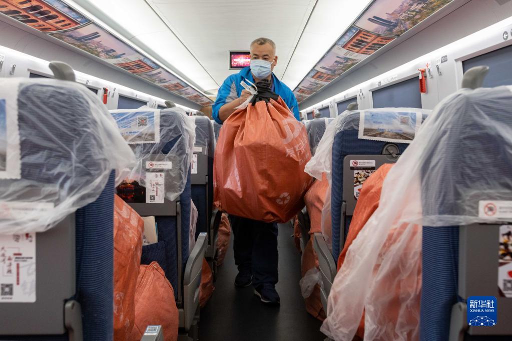 11月1日,在G1373次列車上,鐵路工作人員搬運貨物。