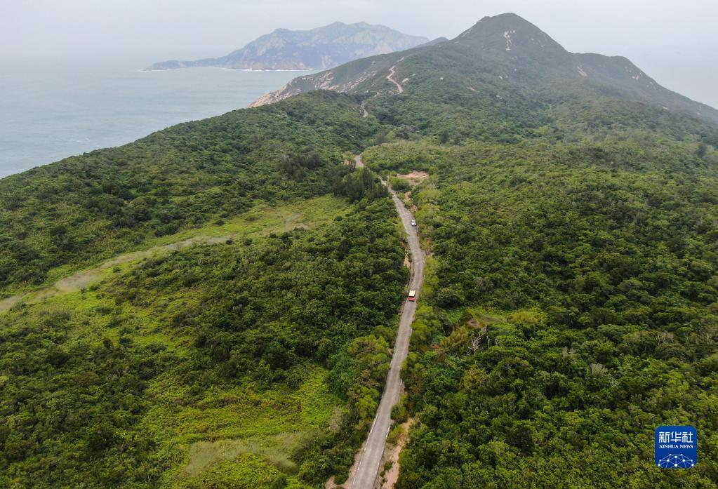 劉清偉和同事駕駛巡邏車在擔桿島巡山(11月1日攝,無人機照片)。