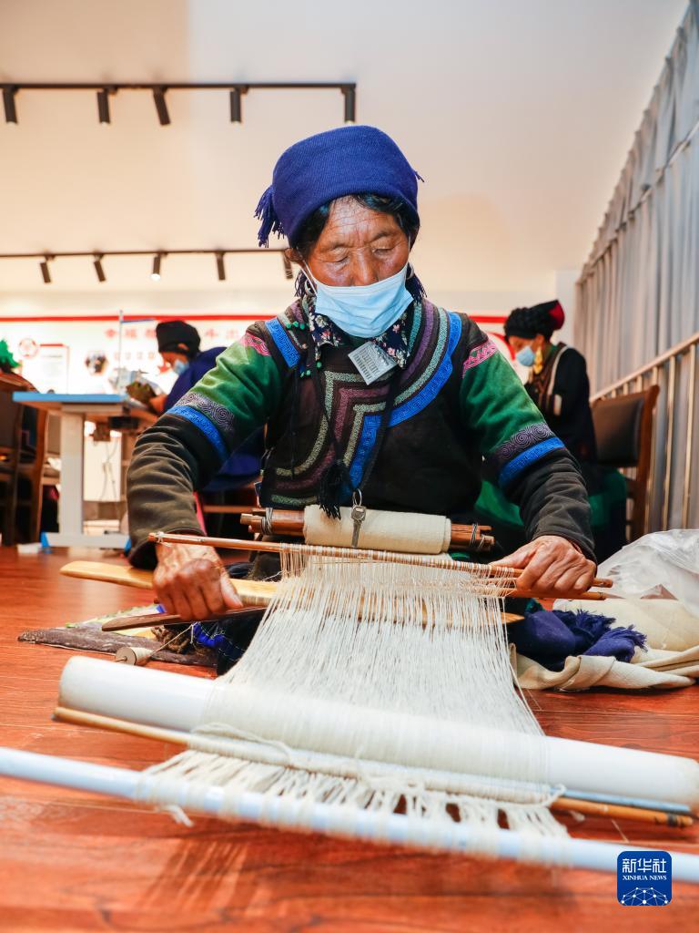 10月27日,在四川省涼山州昭覺縣南坪社區的彝繡工坊,易地扶貧搬遷到此的婦女在紡織用于制作彝族傳統服裝“查爾瓦”的布匹。這個彝繡工坊有100多名繡娘,依照訂單制作彝族傳統服飾制品,繡娘們在此靈活就業,既能為家庭增收,又方便照顧家中老人和孩子,每年可增收數千至上萬元。