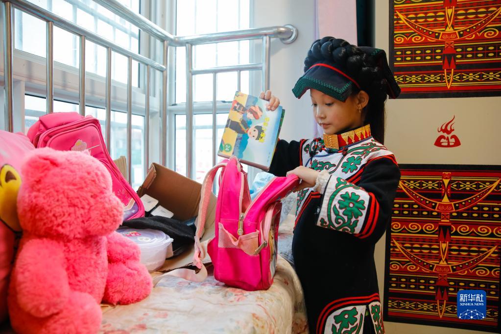 10月28日,在四川省涼山州越西縣越城鎮城北感恩社區,易地扶貧搬遷到此的彝族女孩王小花放學回家后整理書包。學校就在家附近,王小花上學很方便。
