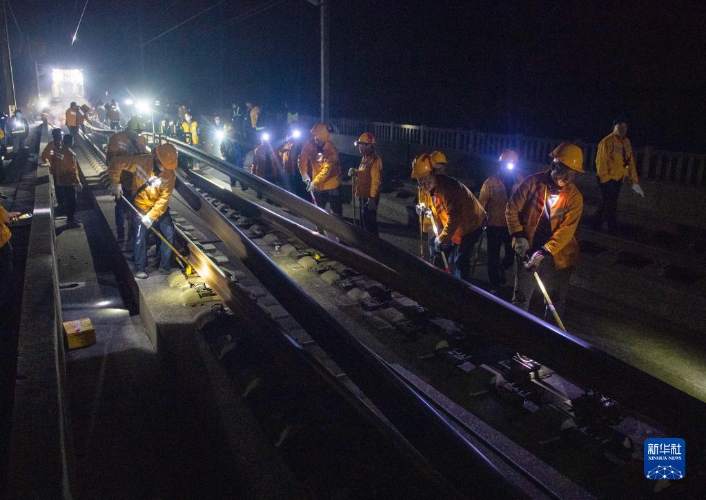11月2日凌晨,鐵路工人在京廣高鐵株洲西至衡山西區間進行換軌施工。