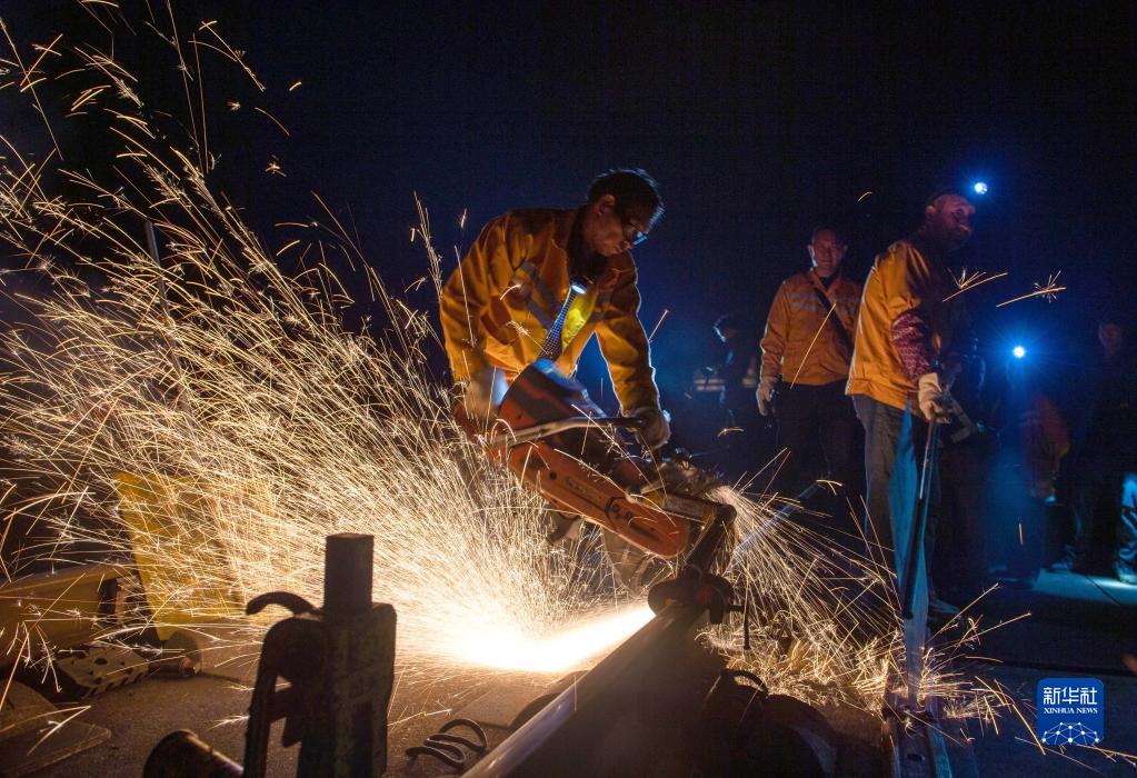 11月2日凌晨,在京廣高鐵株洲西至衡山西區間,鐵路工人在鋸軌。