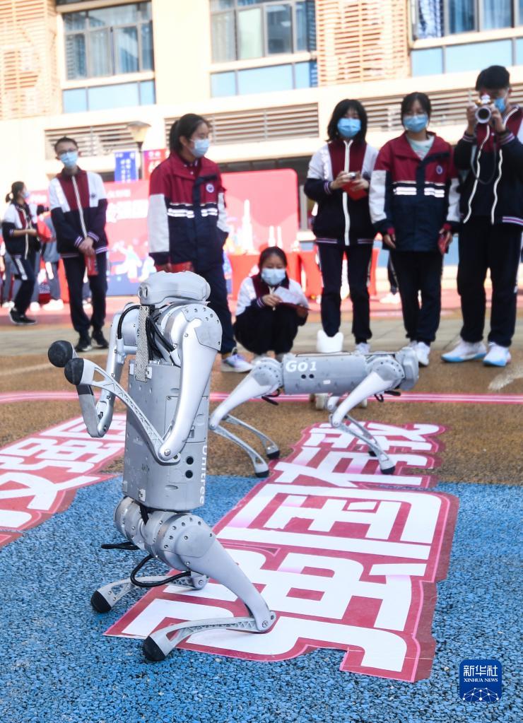 11月2日,重慶市朝陽中學學生在活動現場觀看機器狗展示。