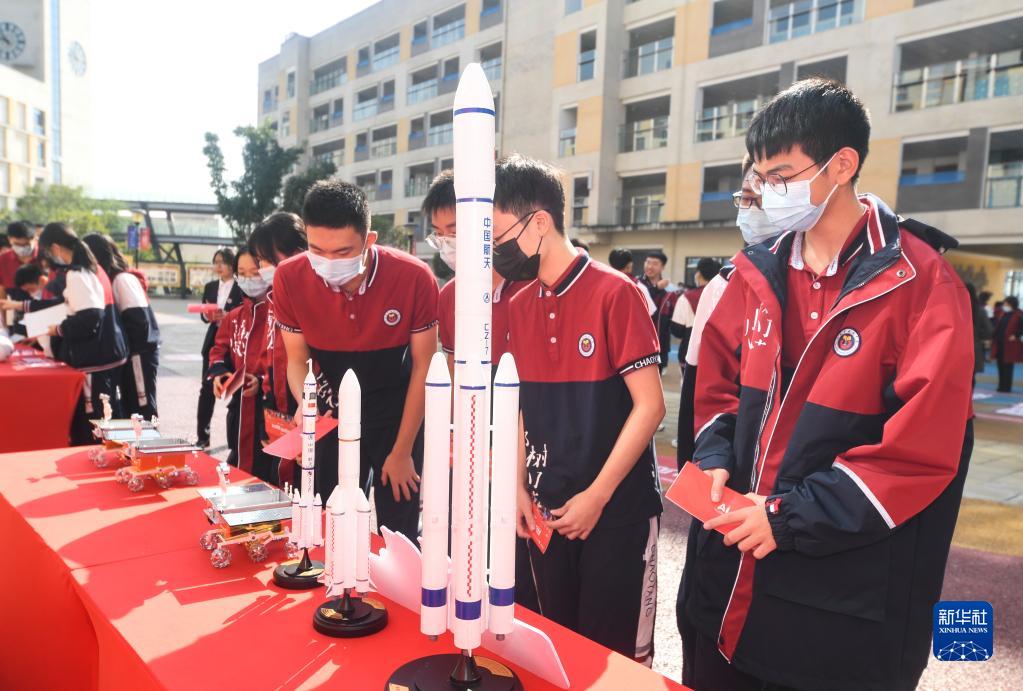 11月2日,重慶市朝陽中學學生在活動現場參觀航空航天展品。