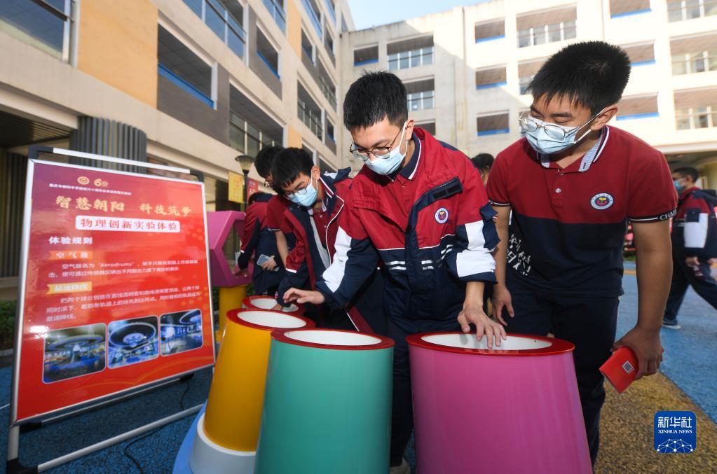 11月2日,重慶市朝陽中學學生在活動現場體驗空氣鼓。