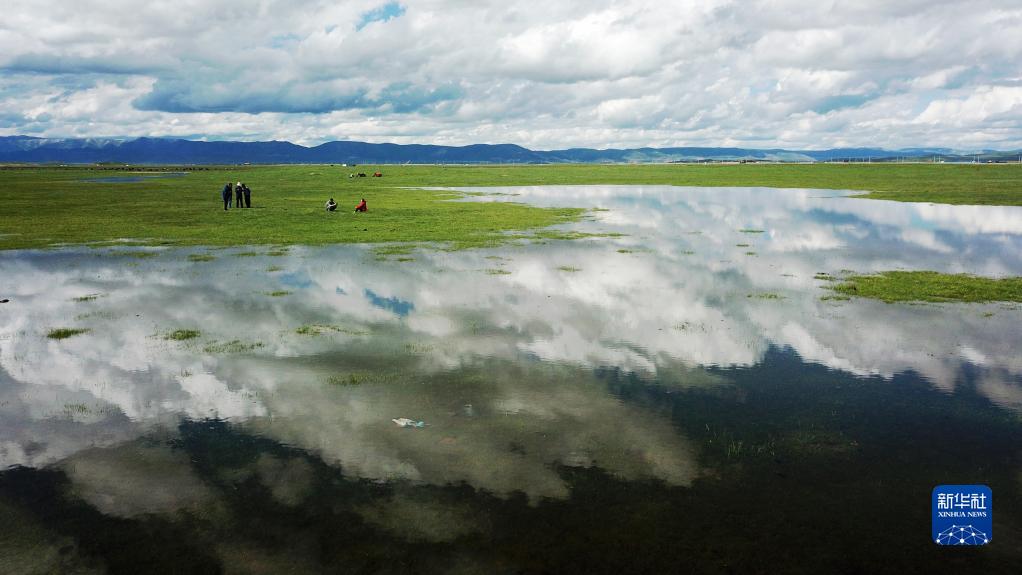游客在甘肅省甘南藏族自治州瑪曲縣河曲馬場的濕地游覽(2019年6月22日攝,無人機照片)。