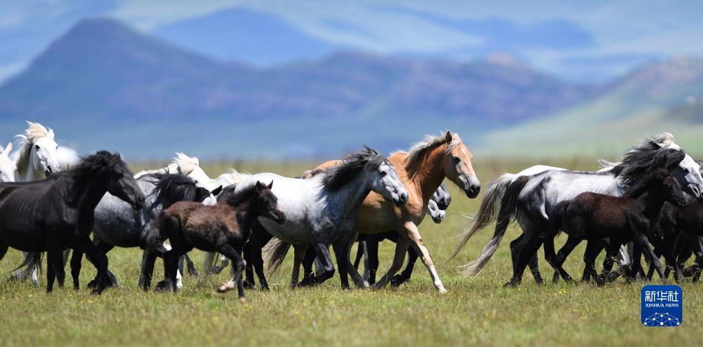 這是在甘肅省甘南藏族自治州瑪曲縣河曲馬場的濕地拍攝的河曲馬(2021年7月15日攝)。