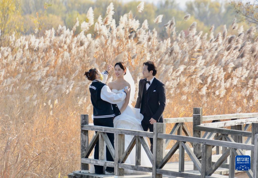 年輕人在北京野鴨湖國家濕地公園拍攝婚紗照片(11月1日攝)。