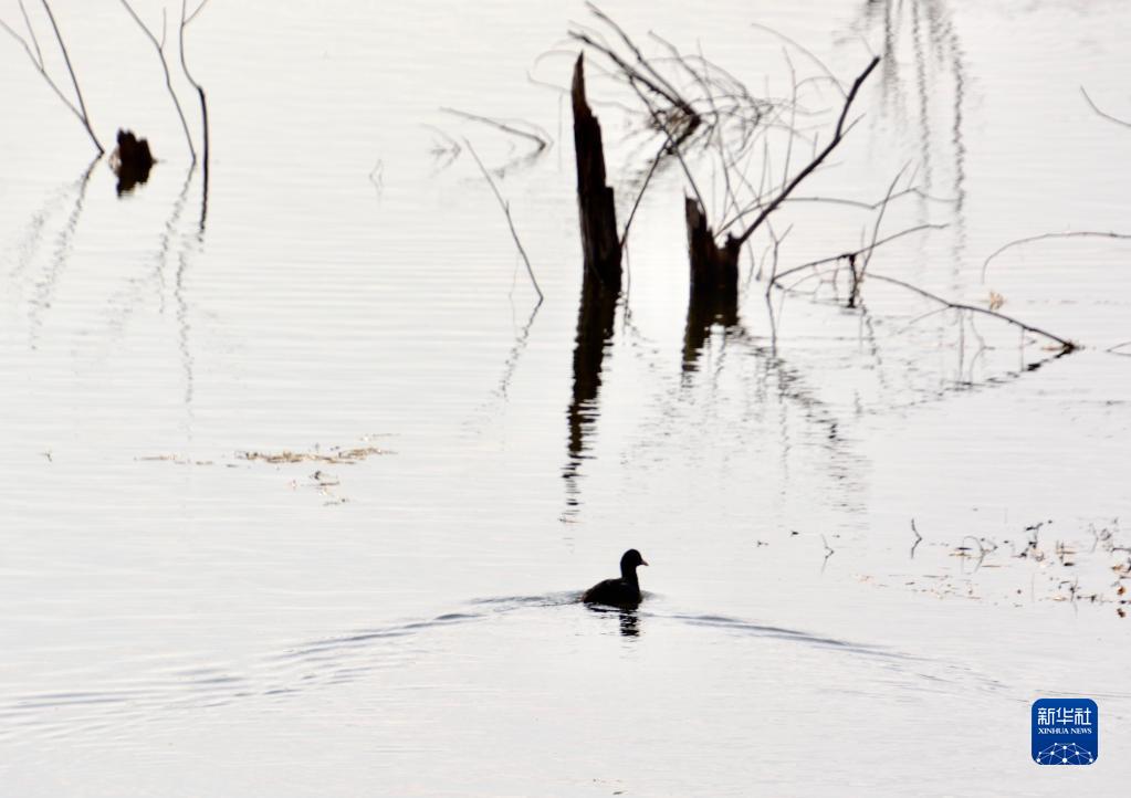 赤膀鴨在北京野鴨湖國家濕地公園的濕地湖泊內(11月1日攝)。