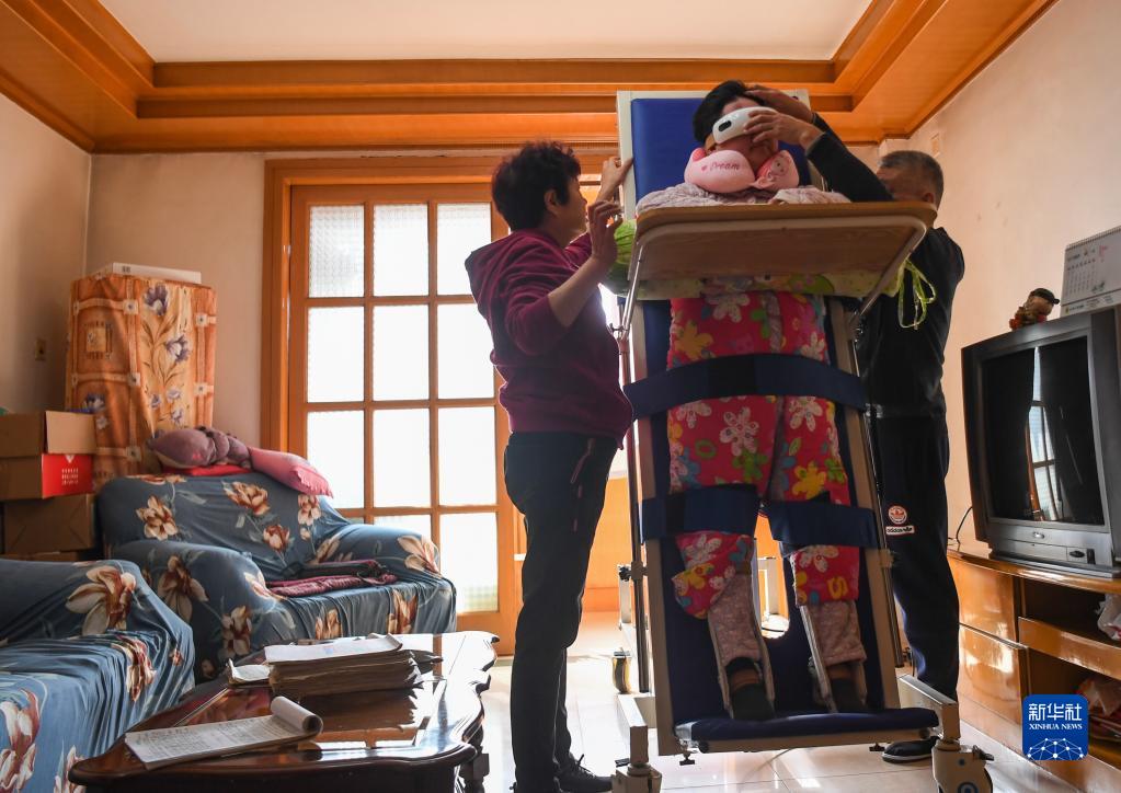 華波(右)、胡燕均夫婦幫助女兒進行站床康復訓練(11月1日攝)。