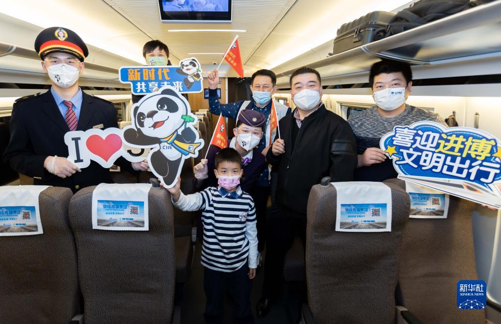 11月2日,在G1724次列車內,旅客與乘務人員為進博會送上祝福。