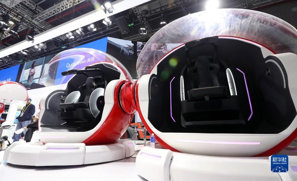 11月2日拍攝的美國高通公司展臺上的一組游戲體驗倉展品。