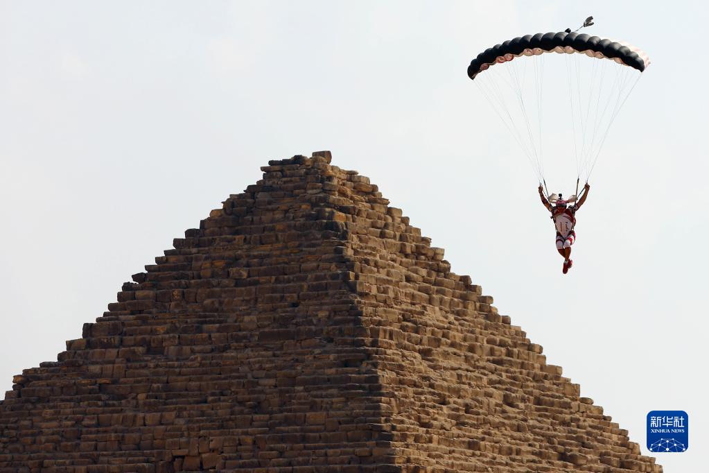 11月2日,在埃及吉薩金字塔景區,運動員進行跳傘表演。