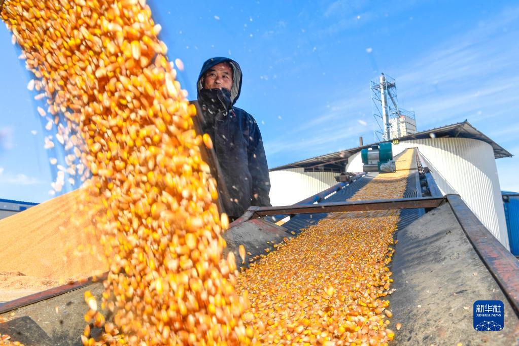 在吉林省公主嶺市樂農糧食收儲有限責任公司,工作人員通過傳送帶將玉米轉運至存儲倉(11月2日攝)。
