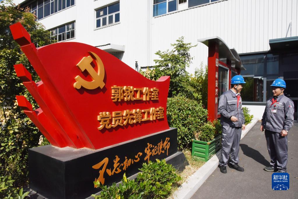 11月2日,在中車青島四方機車車輛股份有限公司郭銳工作室外,郭銳(左)在與工友交流。