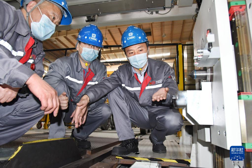 11月2日,在中車青島四方機車車輛股份有限公司轉向架分廠車間,郭銳(右一)與同事對自動檢測主動找正裝置進行驗證。