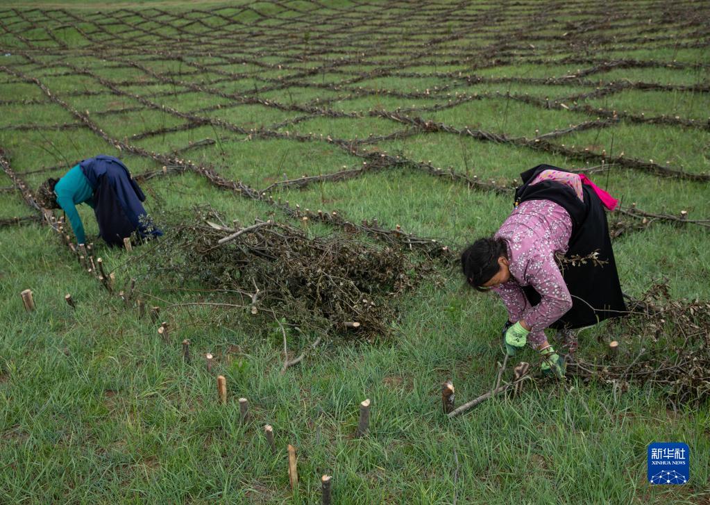 在若爾蓋縣麥溪鄉黑河村,村民用高原柳編成沙障(2022年7月25日攝)。