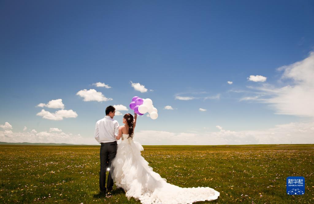 四川若爾蓋濕地國家級自然保護區鮮花盛開時節,一對情侶在拍攝婚紗照(2022年6月24日攝)。