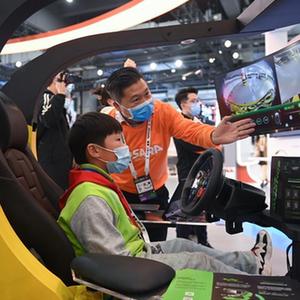 11月3日,小學生在展館體驗自動駕駛技術的操作平臺。