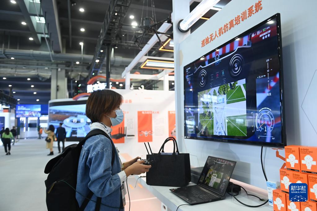 11月3日,觀眾在展館體驗巡檢無人機仿真培訓系統。