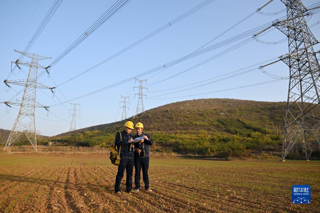 11月2日,在宿州市埇橋區符離鎮,廖志斌(右)和同事對輸電線路進行巡檢。
