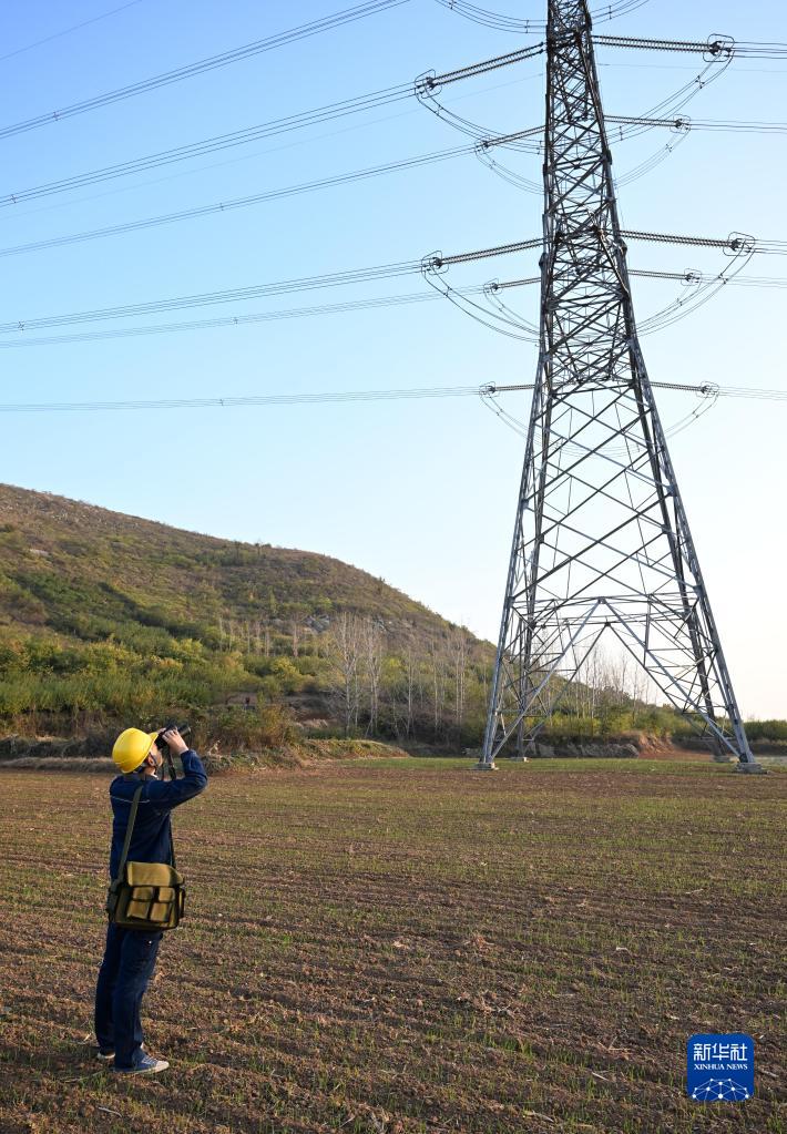 11月2日,在宿州市埇橋區符離鎮,廖志斌用望遠鏡對輸電線路進行巡檢。