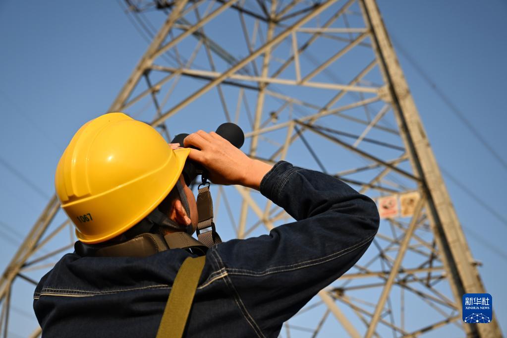 11月2日,在宿州市埇橋區符離鎮,廖志斌用望遠鏡對輸電線路進行巡檢。