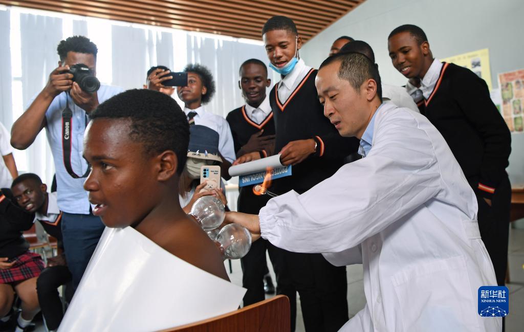 11月3日,在納米比亞首都溫得和克的毛澤東主席中學,中國援納醫療隊醫生為學生演示拔火罐。