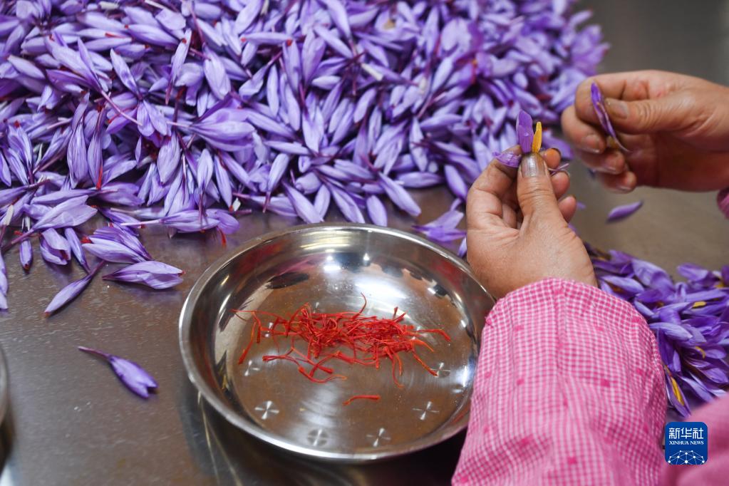 11月4日,在建德市三都鎮圣江村的西紅花基地里,農戶們在從收獲的西紅花里抽出花絲。
