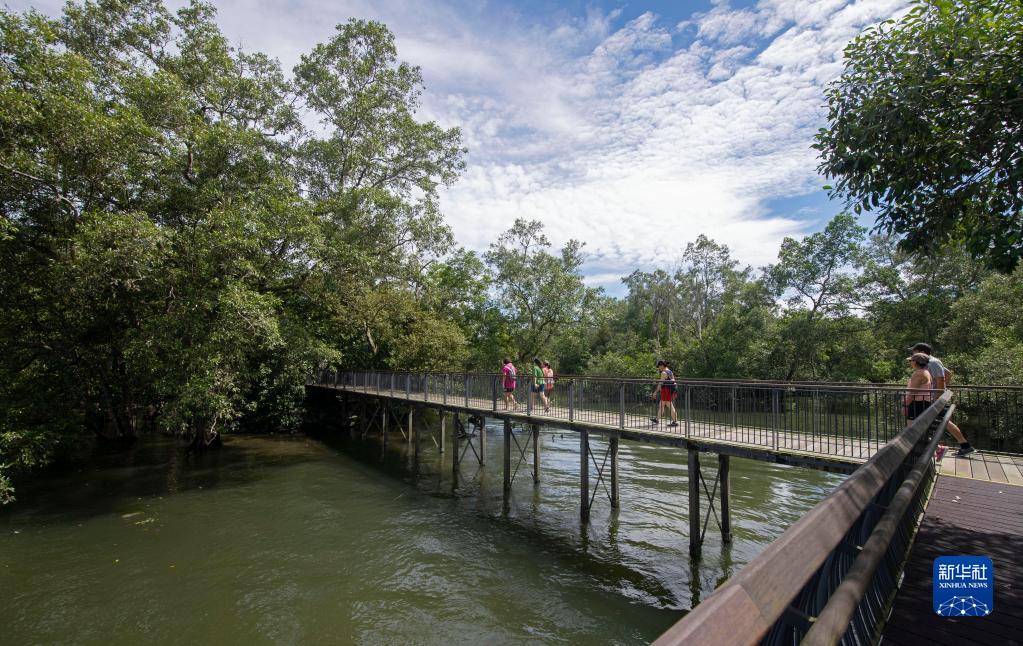 10月27日,在新加坡雙溪布洛濕地保護區,人們走在紅樹林間的木棧道上。