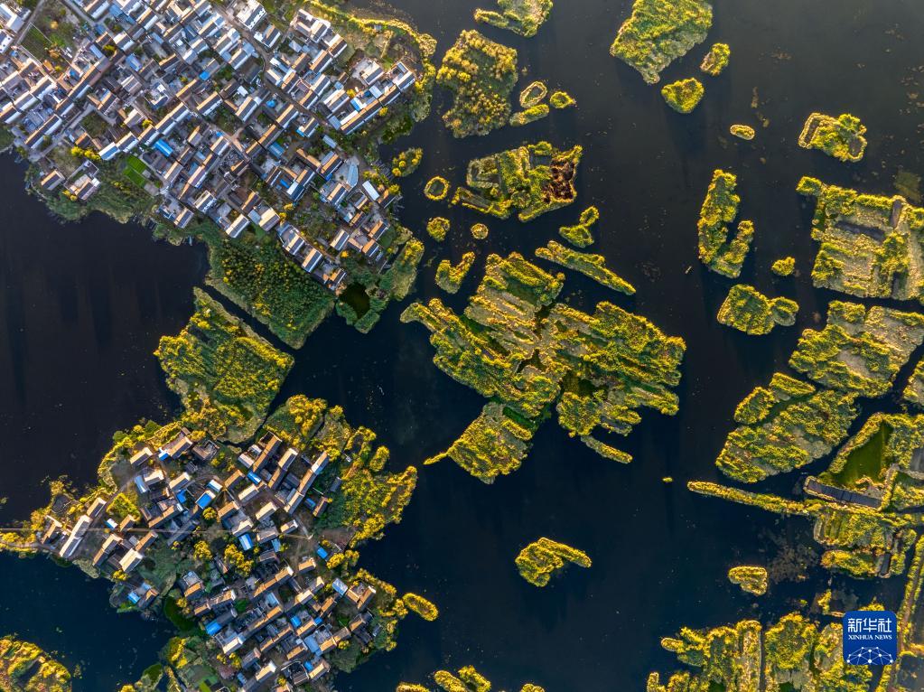 從空中俯瞰西湖國家濕地公園里的村莊及濕地(無人機照片,10月28日攝)。
