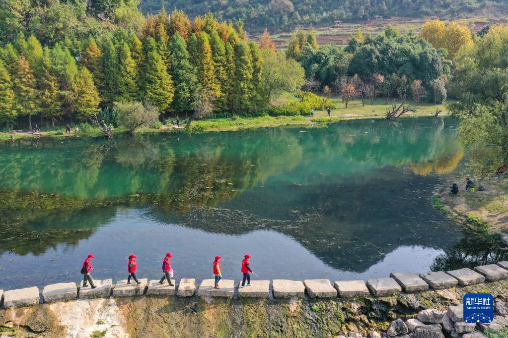 11月4日,在貴州貴陽,周余慶(右一)與志愿者一起在花溪國家城市濕地公園內巡河(無人機照片)。