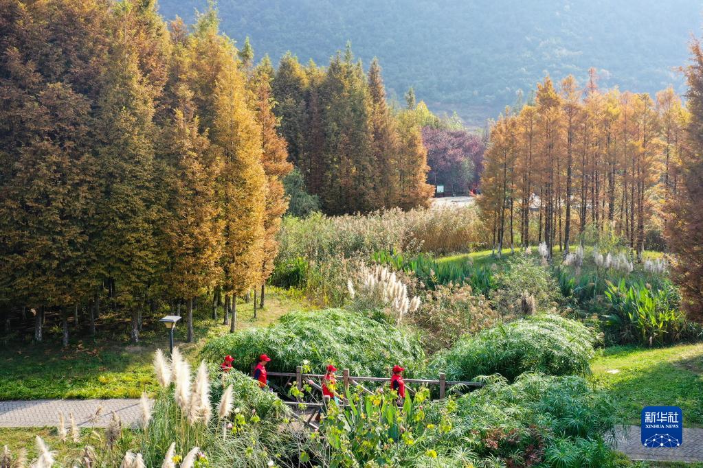 11月4日,在貴州貴陽,周余慶(右一)與志愿者一起在花溪國家城市濕地公園內巡查(無人機照片)。