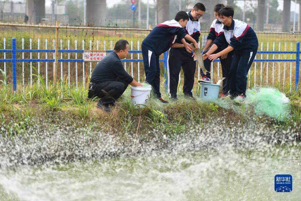 11月4日,在長沙市天心區明德啟南中學,學生們跟著老師在農場體驗捕魚。