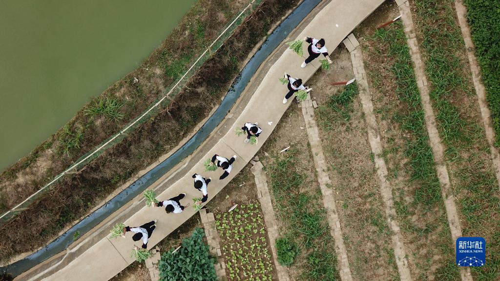 11月4日,在長沙市天心區明德啟南中學,學生們在農場運送蔬菜(無人機照片)。