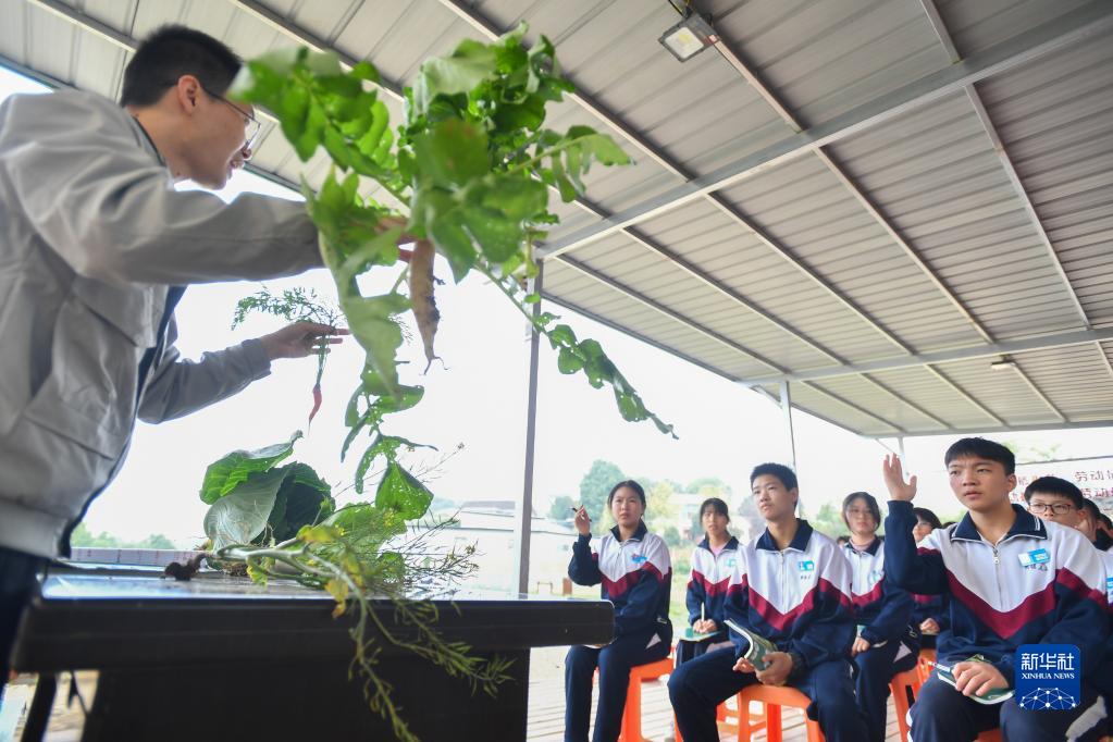 11月4日,在長沙市天心區明德啟南中學,學生們在上勞動課時學習蔬菜的知識。