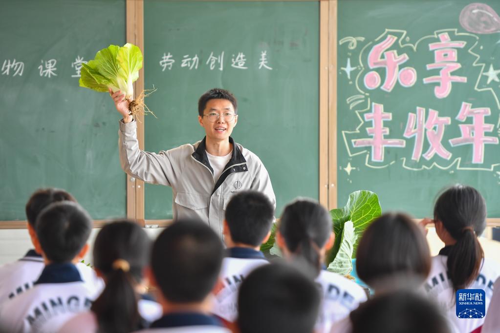 11月4日,在長沙市天心區明德啟南中學,生物老師在給學生們上課時講解蔬菜的知識。