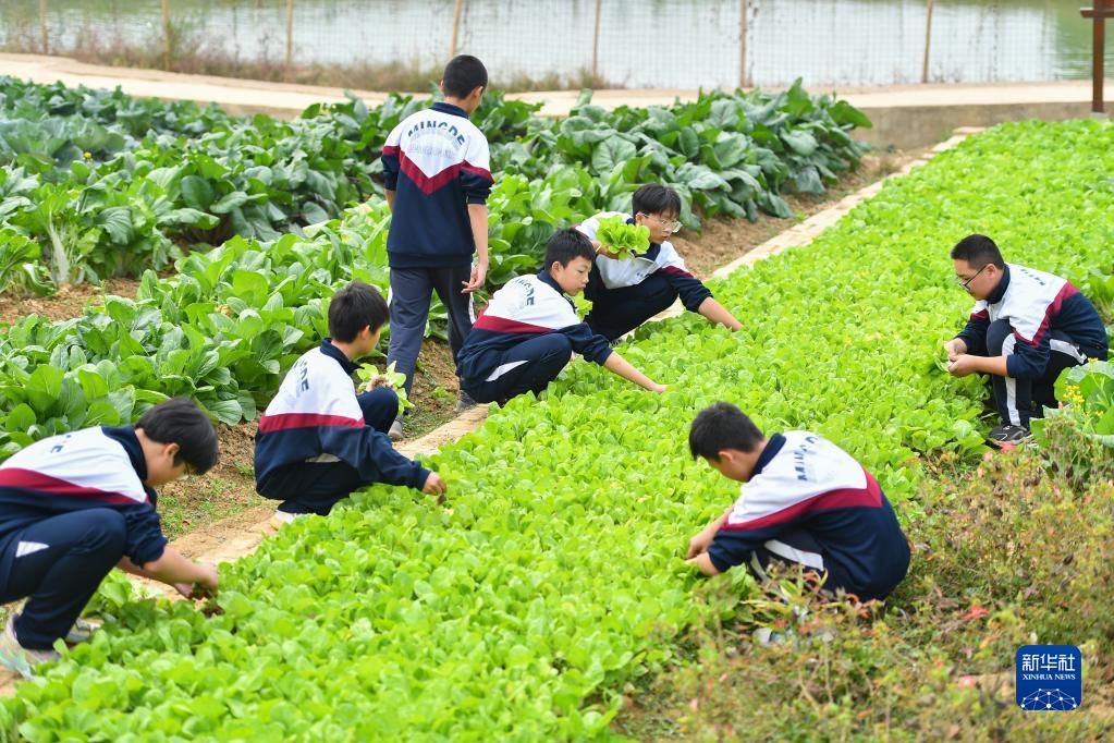 11月4日,在長沙市天心區明德啟南中學,學生們在農場采摘蔬菜。