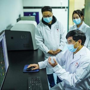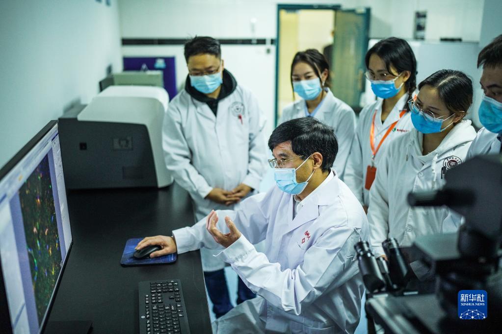 梁貴友(中)在貴州醫科大學分子生物學重點實驗室與師生交流(11月2日攝)。