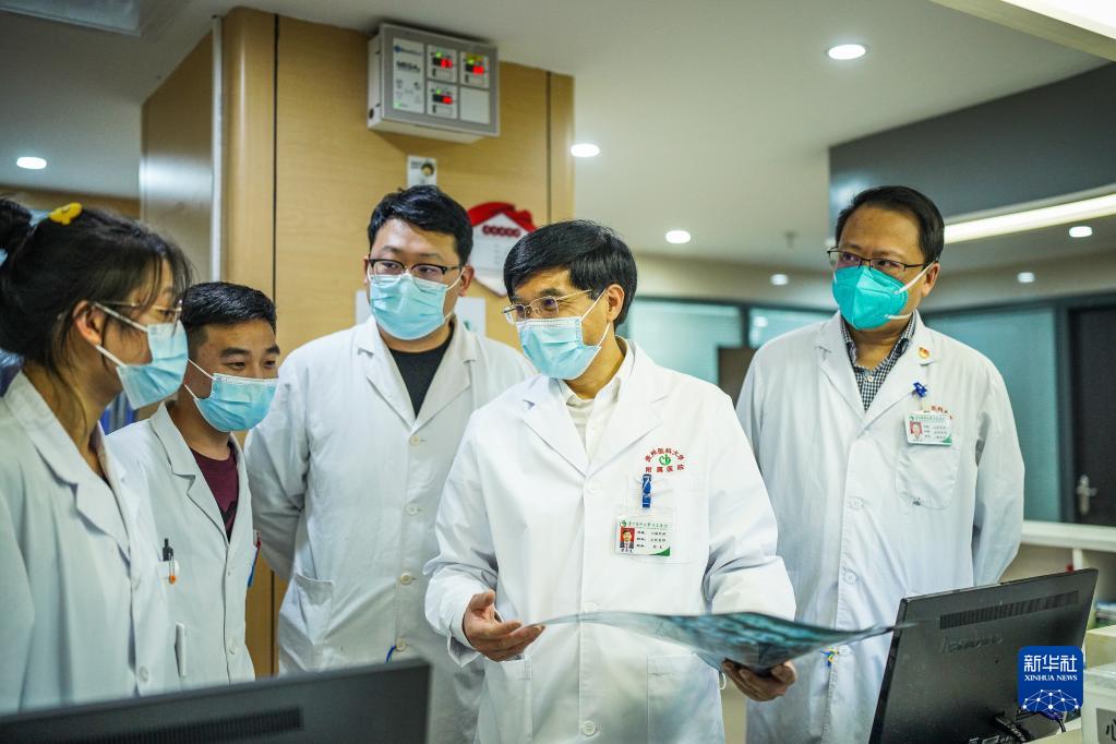 梁貴友(右二)在貴州醫科大學附屬醫院心臟外科與規培、實習學生(左二、左一)進行交流(11月2日攝)。