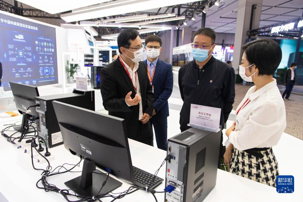 11月4日,工作人員(左一)在2022世界計算大會成果展上向觀眾介紹辦公工作站。