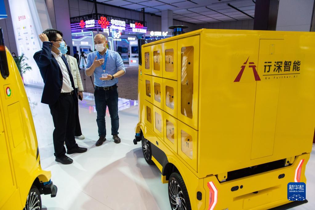 11月4日,工作人員(右)在2022世界計算大會成果展上向觀眾介紹無人車。