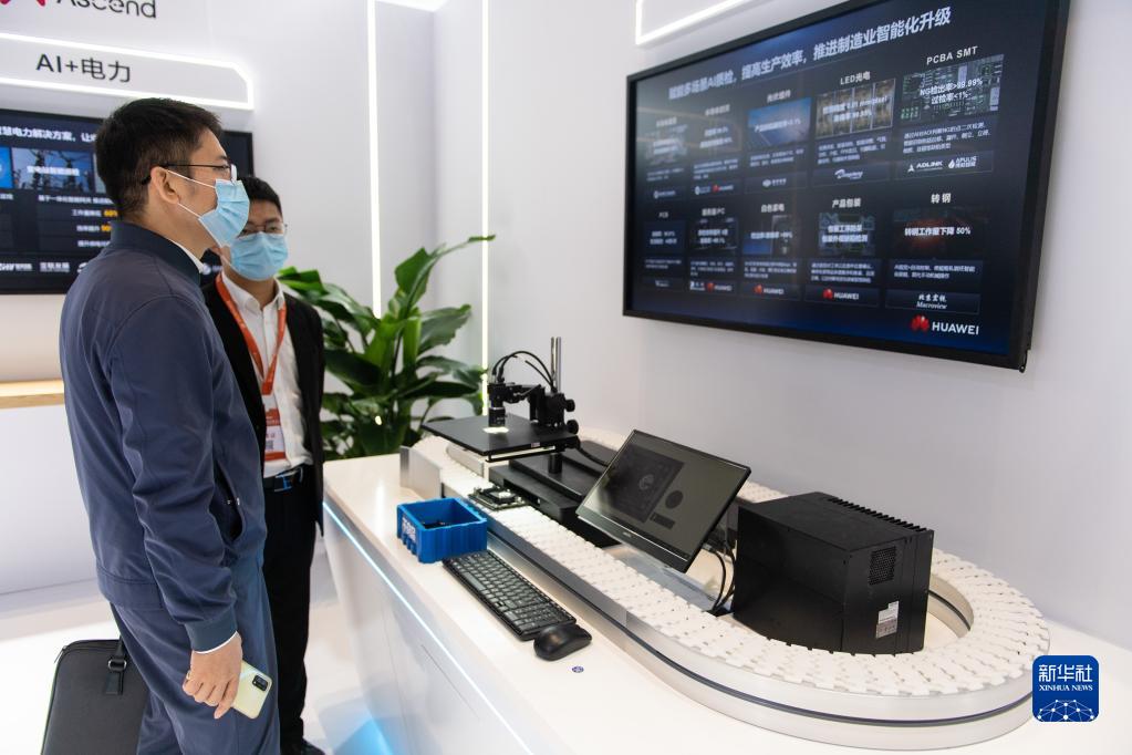11月4日,觀眾(左)在2022世界計算大會成果展上了解質檢機器人。