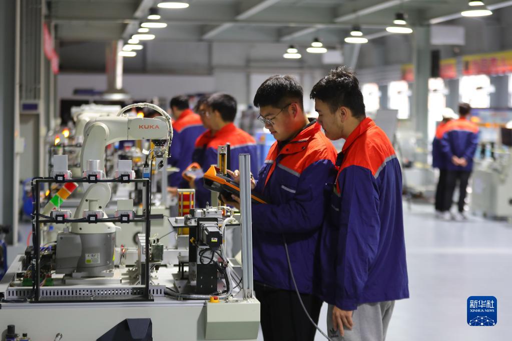 11月2日,在沈陽工學院工業機器人實訓中心,機器人工程專業學生進行工業機器人基礎實踐應用操作。