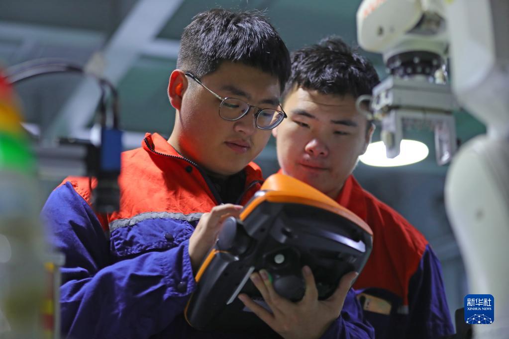 11月2日,在沈陽工學院工業機器人實訓中心,機器人工程專業學生進行工業機器人基礎實踐應用操作。