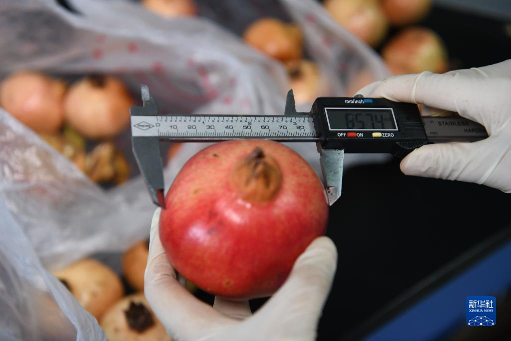 11月3日,在安徽省農業科學院園藝研究所實驗室內,石榴創新團隊成員在對石榴進行測量。