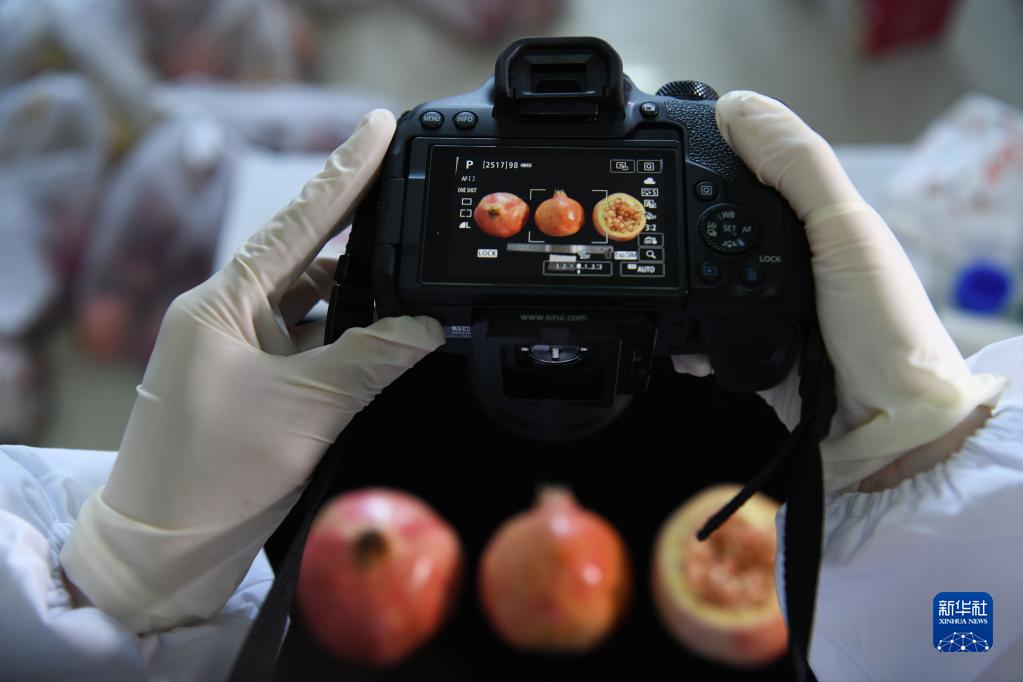 11月3日,在安徽省農業科學院園藝研究所實驗室內,石榴創新團隊成員曹榛在給石榴拍照。