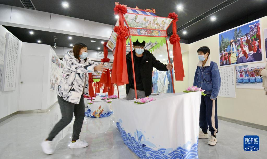 游人在柳溝村的旱船博物館體驗傳統的舞旱船(11月2日攝)。