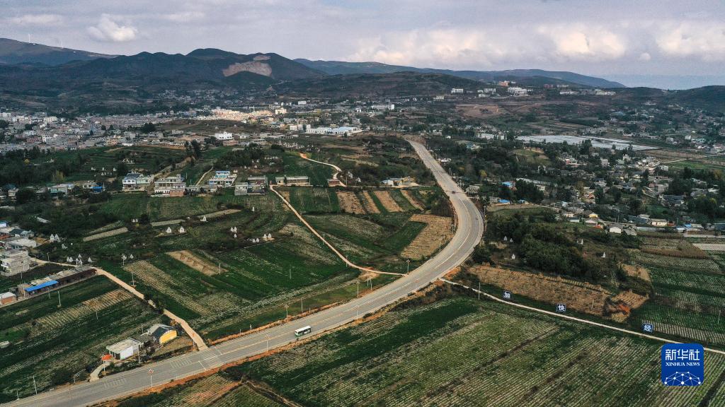 11月3日,鄉鎮公交車行駛在威寧縣迤那鎮開往牛棚鎮的公路上(無人機照片)。
